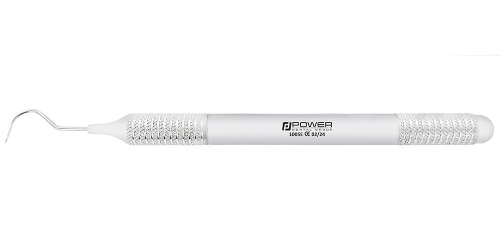 Explorer 23 (Shepherd’s Hook) – is a diagnostic instrument for examining pits and fissures, suspected carious lesions, locating root-canal orifices, and evaluating restoration or orthodontic margins. Its strongly curved hook with a fine, sharp tip reaches deep, hard-to-access areas and delivers excellent tactile feedback. The 6EZ handle features a larger diameter and deep knurling for confident control with reduced hand fatigue.